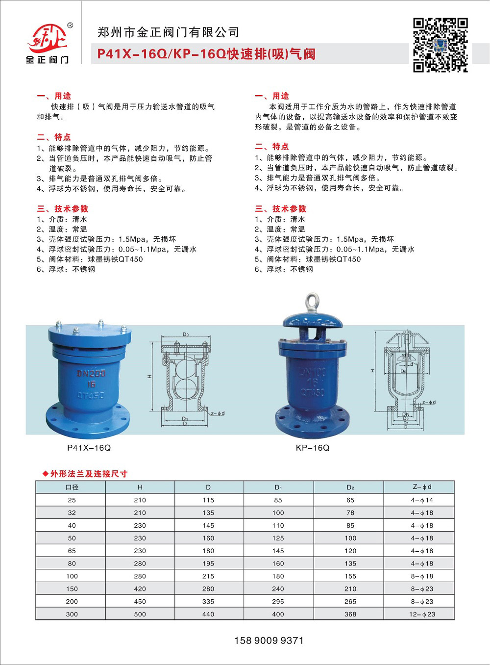 一、用途:快速排(吸)气阀是用于压力输送水管道的吸气和排气。