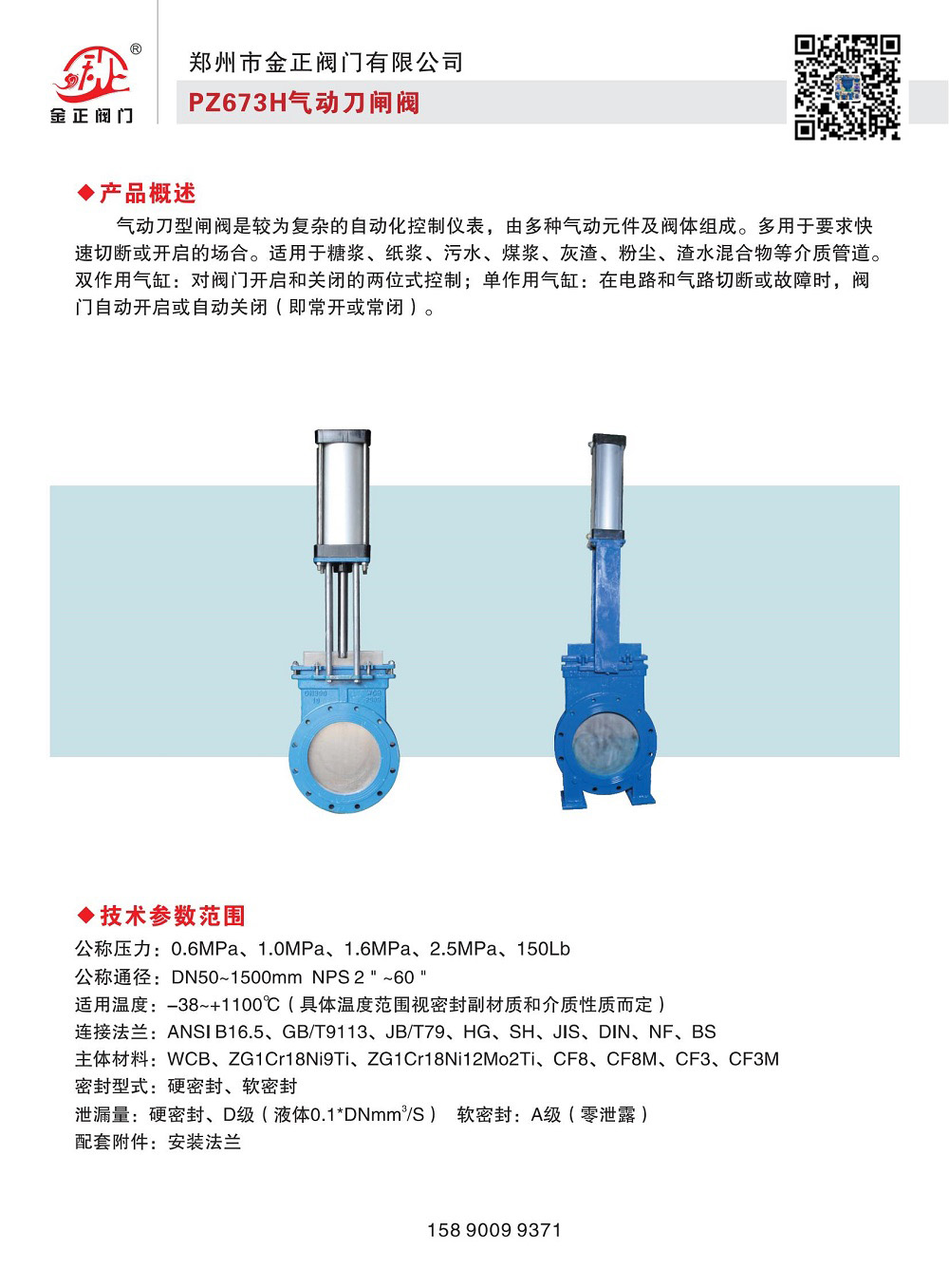 气动刀型闸阀是较为复杂的自动化控制仪表,由多种气动元件及阀体组成。多用于要求快速切断或开启的场合。适用于糖浆、纸浆、污水、煤浆、灰渣、粉尘、渣水混合物等介质管道。双作用气缸∶对阀门开启和关闭的两位式控制;单作用气缸;在电路和气路切断或故障时,阀门自动开启或自动关闭(即常开或常闭)。